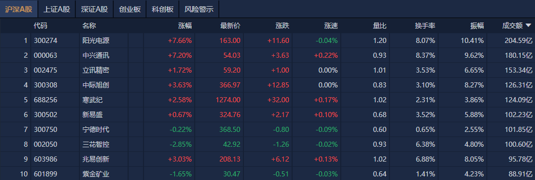 个股方面,阳光电源成交额超204亿元居首,中兴通讯、立讯精密、中际旭创成交额靠前。